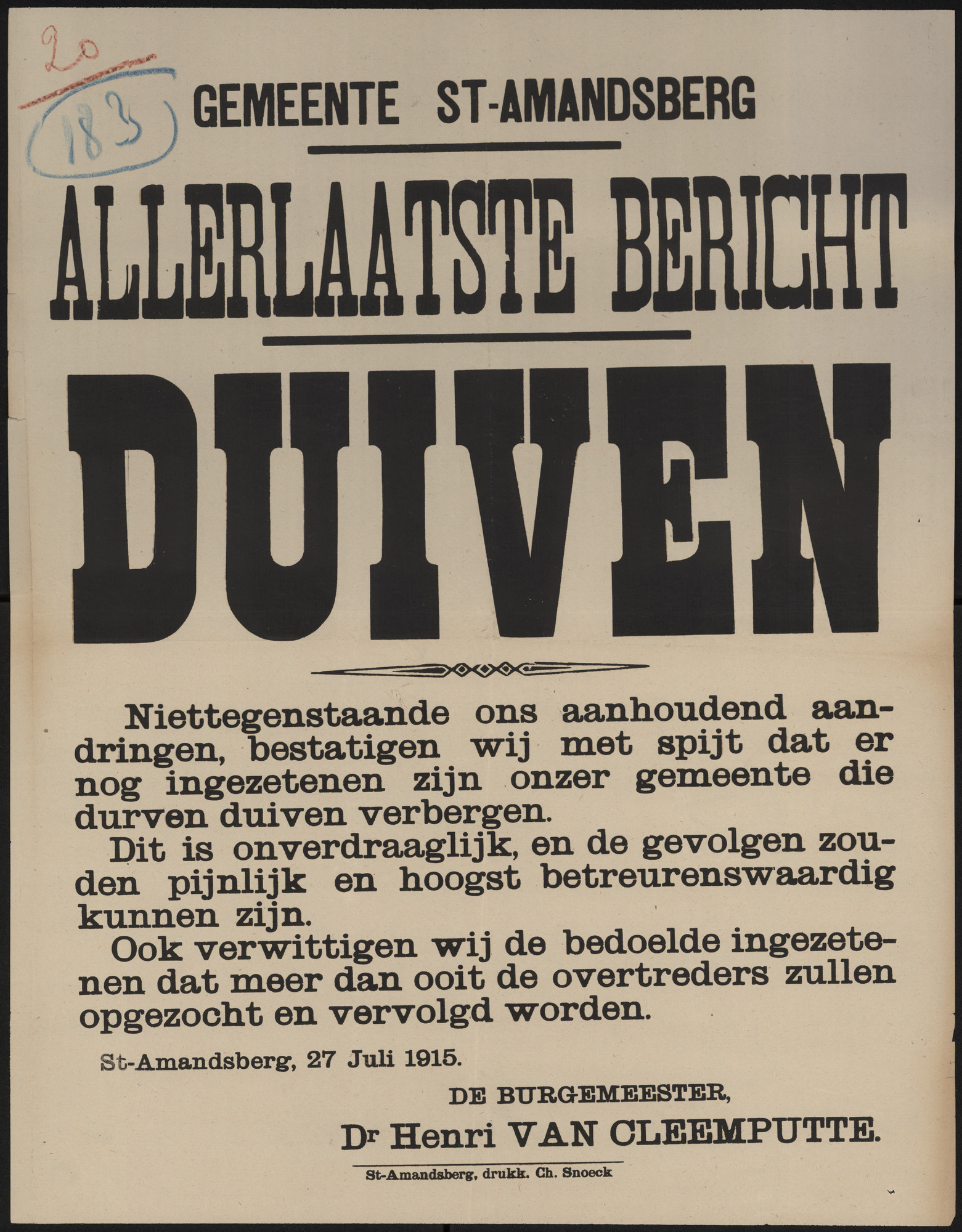 De Duitse militaire overheid voert de identiteitskaart met foto in. Belgen zijn verplicht de kaart bij zich te dragen. In eerste instantie is een identiteitsbewijs enkel nodig om het Etappegebied te verlaten, vanaf 1916 wordt iedereen verplicht er een te laten maken. Vier jaar lang komt de Belg dus niet verder meer dan zijn eigen gemeentegrens, tenzij hij of zij de nodige documenten kan voorleggen.