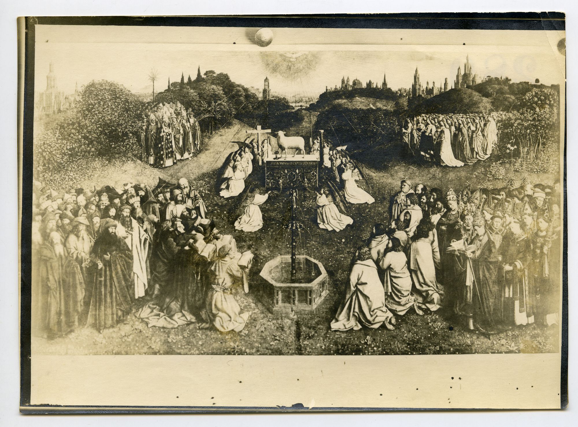 Al snel na hun aankomst gaan de Duitsers op zoek en Van den Gheyn legt uit dat het werk zich in Londen bevindt. Na wat aarzelen aanvaarden de Duitsers deze uitleg. In de zomer van 1916 beginnen zij echter hoe langer hoe meer te twijfelen aan het Britse verhaal. In een eerste fase concentreert hun zoektocht zich op de kathedraal, speciale gezanten doorzoeken vergeefs het hele gebouw. Ook Van den Gheyn wordt stevig aan de tand gevoeld, maar hij verschuilt zich achter Van den Heuvel, die sinds 1915 veilig in Rome zit als gezant bij de Heilige Stoel. Begin 1918 nemen de Duitsers steeds meer burgerhuizen in beslag. Veiligheidshalve wordt het schilderij op 4 februari overgebracht naar een andere schuilplaats. Ook na de oorlog blijft Van den Gheyn koppig zwijgen over de schuilplaatsen. In 1920 worden alle panelen van het retabel, inclusief de zijpanelen die in 1816 door Willem III van Pruisen waren aangekocht en in Berlijn verbleven, herenigd in de kathedraal.