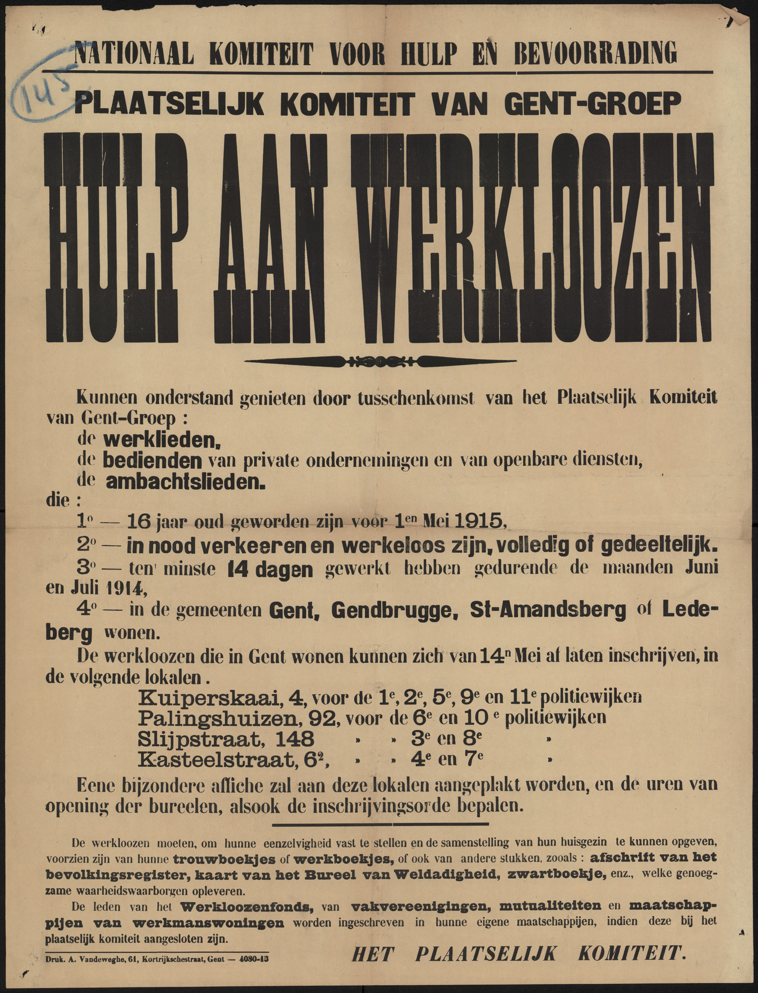 Van in het begin van de oorlog is de voedselbevoorrading het grootste probleem. De binnenlandse productie is ontoereikend, de Britse maritieme blokkade belet de invoer van levensmiddelen en dan zijn er nog de vele Duitse opeisingen. De Stad Gent richt al op 8 augustus 1914 een Stedelijk Comité der Volksvoeding op, dat gratis soep en brood uitdeelt. In het najaar wordt de voedselsituatie evenwel kritiek. Op 23 oktober 1914 wordt in Brussel het Nationaal Hulp- en Voedingscomité opgericht, dat uitgroeit tot de motor achter de nationale hulpverlening. Het voedsel wordt in de Verenigde Staten aangekocht door de Commission for Relief in Belgium. De distributie in België zelf is, via een netwerk van provinciale en lokale comités, in handen van het Nationaal Comité. Het voedsel wordt gerantsoeneerd verkocht in ‘Amerikaanse’ winkels. In 1916 zijn meer dan 60.000 inwoners van Gent afhankelijk van deze voedselhulp. In de loop van de oorlog neemt het Comité steeds meer taken op zich, zoals de organisatie van soepkeukens, melkuitdelingen en schoolmaaltijden, het uitdelen van kledingstukken, werklozensteun, pakjes voor krijgsgevangen en geïnterneerde soldaten. Naast het Nationaal Comité zijn er nog een dertigtal kleinere hulporganisaties actief in Gent. Maar de verschillende initiatieven voor hulp tonen slechts een kant van de medaille. Schaarste betekent in veel gevallen ook hamsteren, zwarte markt en woekerprijzen. ‘Nieuwe rijken’ worden smalend ‘baron Zeep’ genoemd: door het tekort aan zeep wordt het maken van ersatz zeep bijzonder winstgevend.