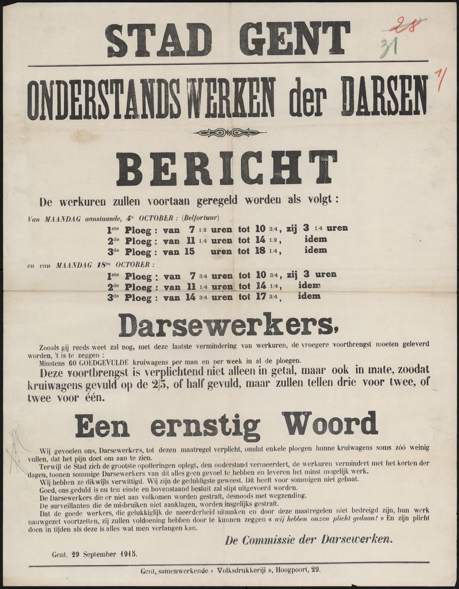 Door de voortdurende opeisingen van grondstoffen en het ontmantelen van machines valt de industrie in de loop van de oorlog zo goed als volledig stil. In Gent sluiten bedrijven in de metaalnijverheid (eind 1914), vlasfabrieken (eind 1915) en katoenweverijen (1917) noodgedwongen de deuren, met massale werkloosheid als gevolg. In maart 1916 zijn er al meer dan 38.000 werklozen in de stad. In het najaar van 1914 zet het stadsbestuur ca. 6.000 arbeiders in bij het — met de hand — graven van het Middendok, maar in juni 1916 komt een einde aan deze Darsewerken. Vanaf 1915 krijgen alle werkloze arbeiders en bedienden een kleine uitkering, betaald via de vakbonden. In 1917 kan iedereen steun aanvragen bij het Nationaal Hulp- en Voedingscomité, de overkoepelende hulporganisatie. Krijgsgevangenen worden ingezet door het Duitse leger als dwangarbeiders in de oorlogsindustrie. Van bij het begin van de oorlog komt de draadtrekkerij in Gentbrugge, beter bekend als de Puntfabriek, in handen van het Duitse leger. Aanvankelijk werken er Duitse arbeiders-soldaten, maar dit verandert in 1916. Er moeten Belgische arbeiders werken, net als Italiaanse, Franse en Russische krijgsgevangenen. De levensomstandigheden van de Russische krijgsgevangenen zijn bijzonder hard, zij krijgen alleen een minimum rantsoen. Uit schrik voor Duitse strafmaatregelen roept de Gentbrugse burgemeester Maurice Verdonck de bevolking op om ‘alle betooging van medegevoel met de tewerkgestelde krijgsgevangenen te staken’.